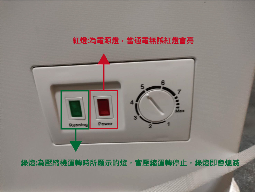 - 功能明確指示含:電源顯示燈、壓縮機啟動顯示燈、溫控旋鈕器。