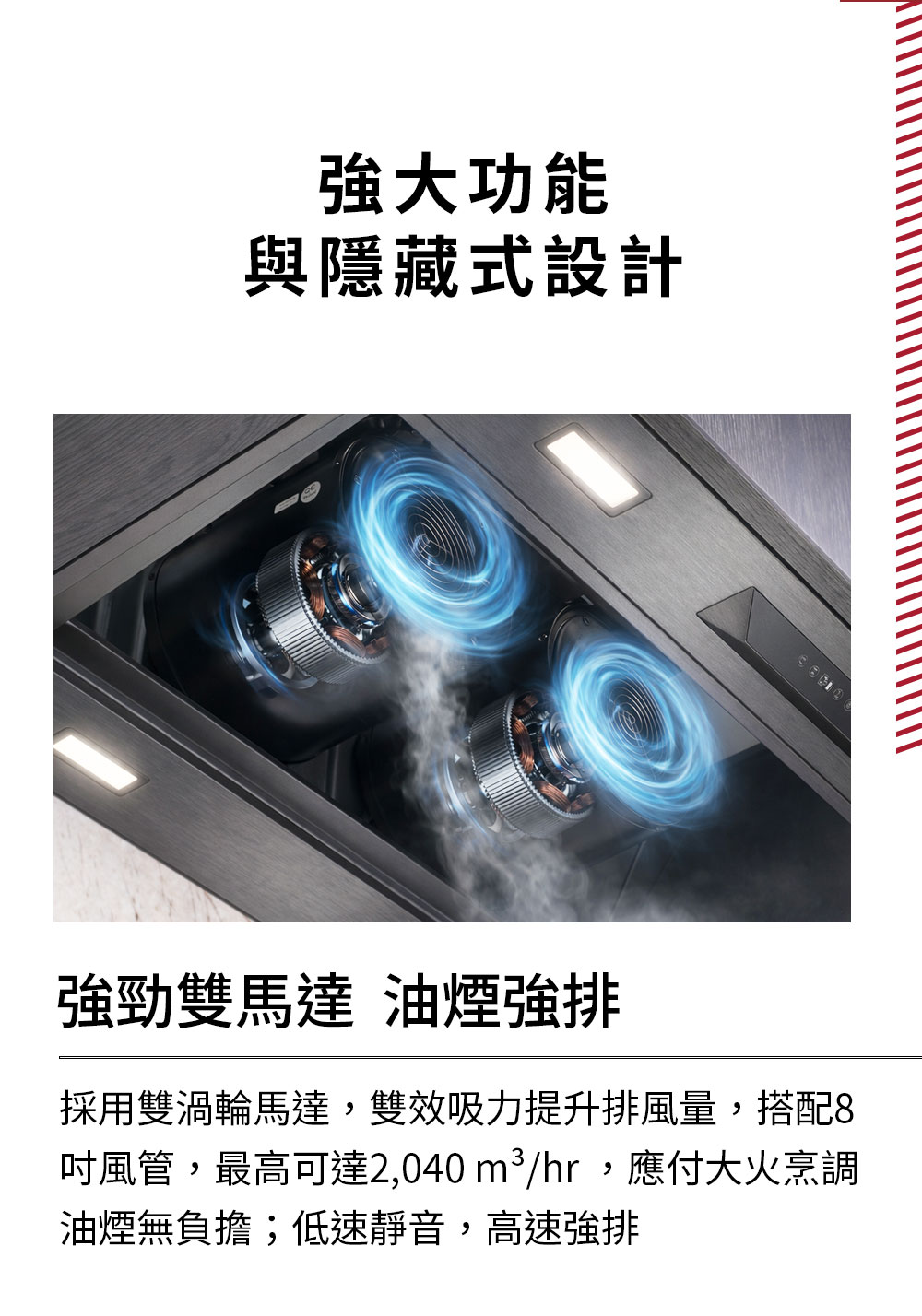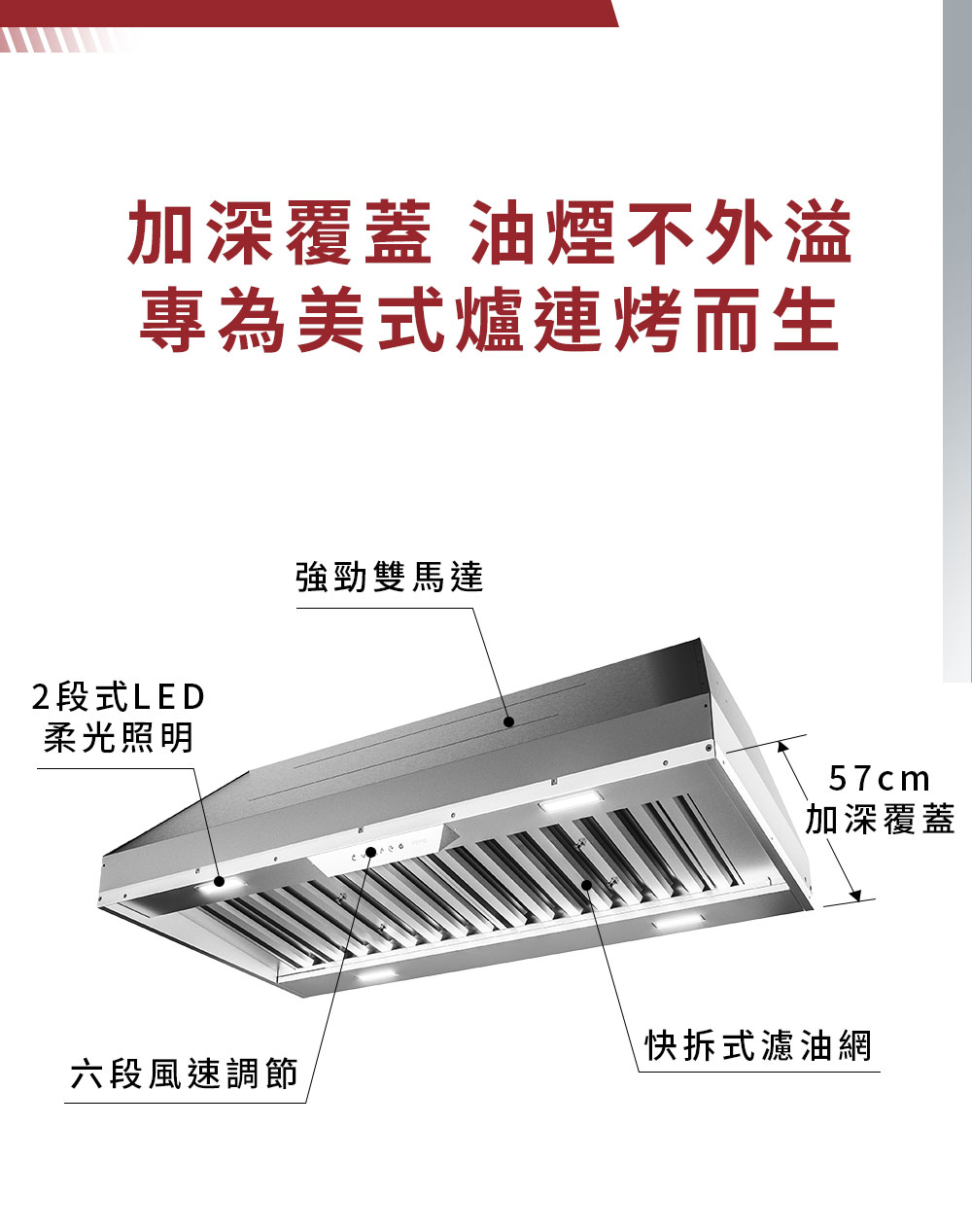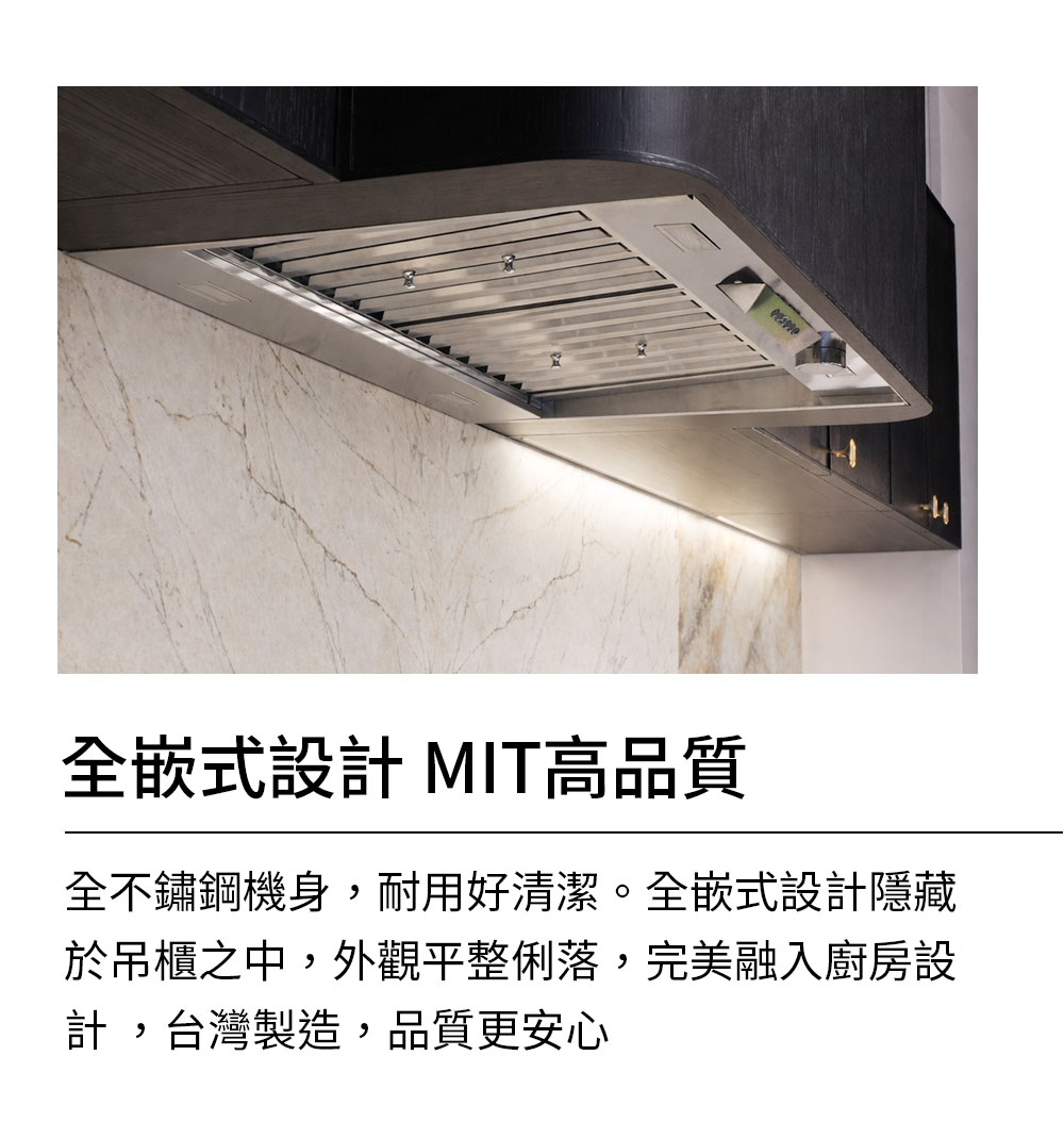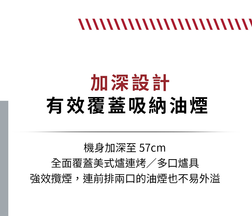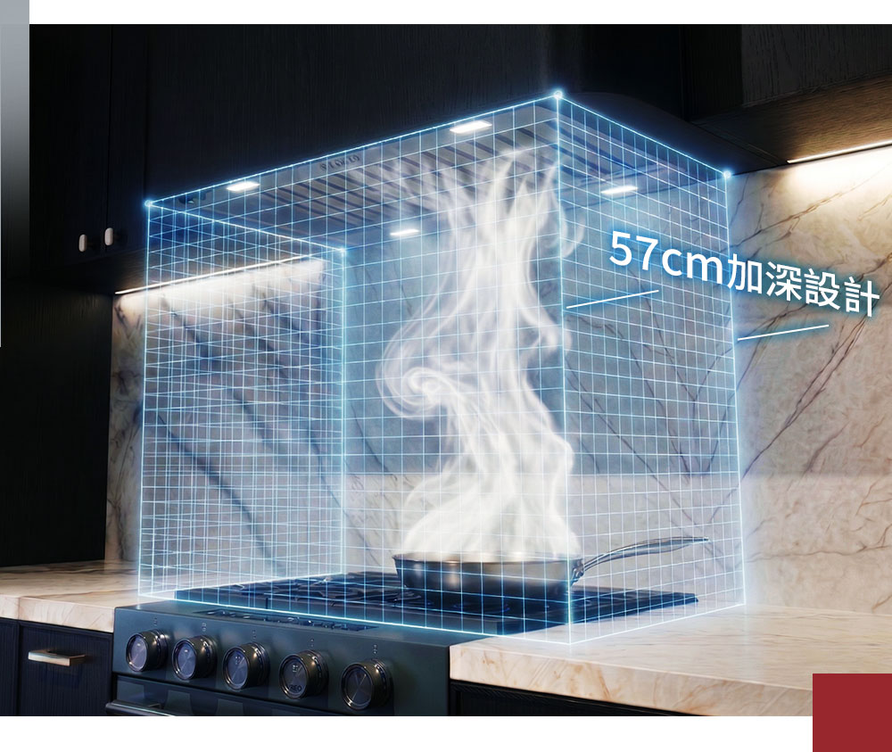 | 安裝預留尺寸 | 煙罩開孔寬度 87.6 公分 煙罩開孔深度 57.4 公分 爐面至機體高度 65-75 公分 室內煙管長度 50 公分 |